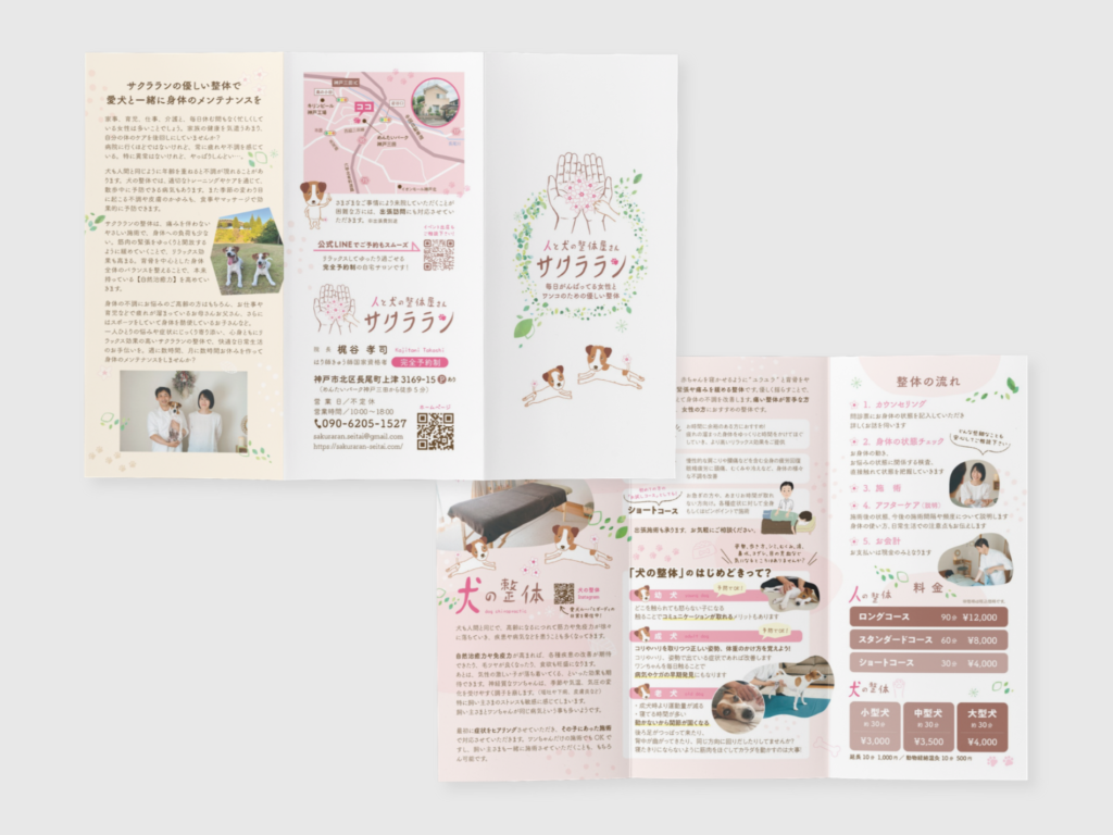 サービス内容や想いを整理し、一枚のリーフレットにまとめます。イベントや営業の場で手渡しできるツールとして、長く使えるデザインを心がけています。